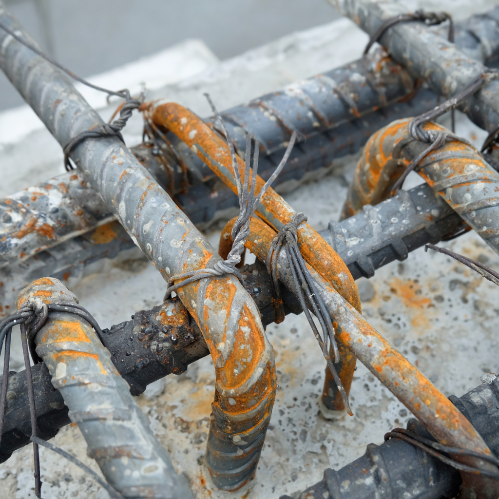 1 งานโครงสร้างฐานราก เป็นการผูกเหล็กแบบเหลี่ยมตะกร้อเพื่อเป็นโครงสร้างรับน้ำหนักจากเสาอาคารลงเข็มที่ได้ลงไว้ โดยขั้นตอนนี้จะผูกเหล็กเส้นข้ออ้อยขนาดตามที่ได้คำนวณไว้กับเหล็กเสาเข็มและผูกกระจายออกไปรอบ ๆ เสาระยะเท่า ๆ กันและผูกตั้งขึ้นตามความหนาของฐานรากที่ได้คำนวณไว้ ซึ่งในขั้นตอนนี้จะต้องนำลูกปูนมารองไว้ระหว่างลีนที่เทไว้กับฐานเหล็กที่ได้ผูกไว้ เพื่อให้ปูนโครงสร้างได้อมเหล็กที่ผูกไว้ทั้งหมด ซึ่งได้มาซึ่งความแข็งแรงตามที่ได้คำนวณไว้