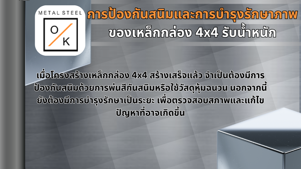 เมื่อโครงสร้างเหล็กกล่อง 4×4 สร้างเสร็จแล้ว จำเป็นต้องมีการป้องกันสนิมด้วยการพ่นสีกันสนิมหรือใช้วัสดุหุ้มฉนวน นอกจากนี้ยังต้องมีการบำรุงรักษาเป็นระยะ เพื่อตรวจสอบสภาพและแก้ไขปัญหาที่อาจเกิดขึ้น